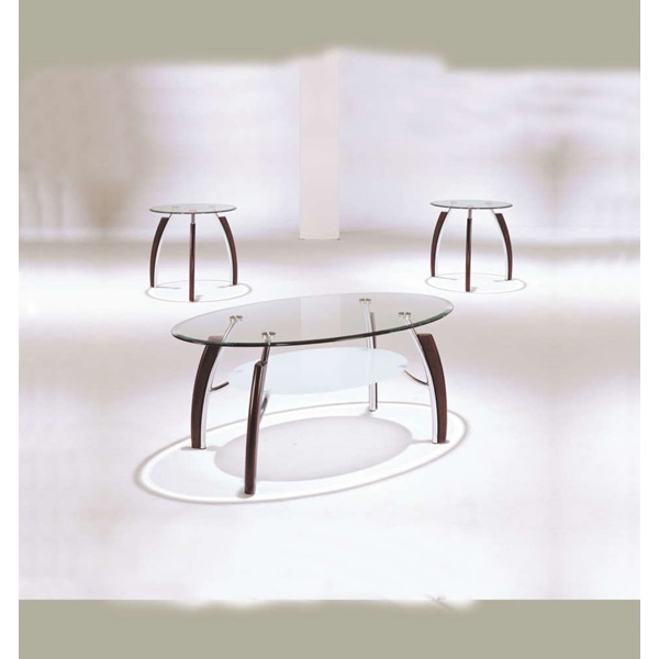 an oval-shaped coffee table and two matching end tables. Each piece features a clear tempered glass top with a beveled rim. Curved, claw like feet support the set, comprised of wood and metal. The wood is finished in cherry while the metal has a polished chrome finish. An oval-shaped lower shelf is incorporated into the coffee table design, made from frosted glass.